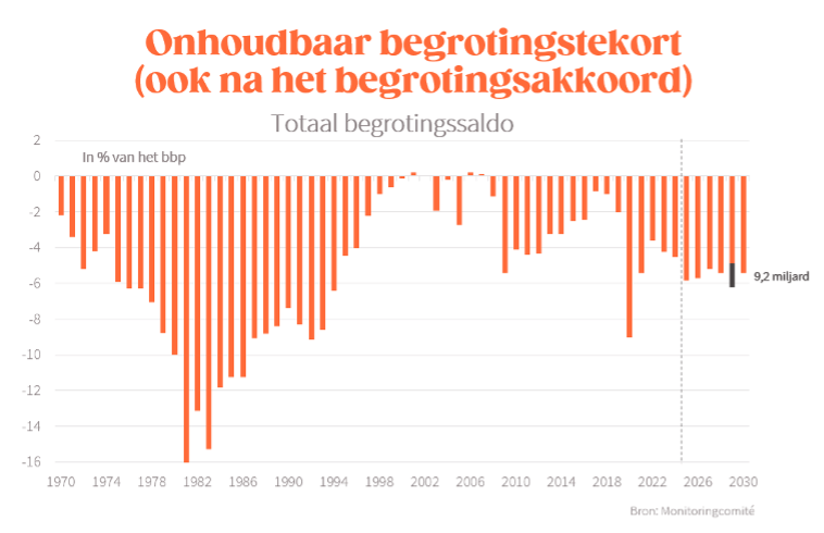 Om tegen het einde van deze legislatuur het gezamenlijke begrotingstekort van de Belgische overheden terug te dringen naar 3 procent van het bbp, de bovengrens van het tekort voor Europa, is een structurele inspanning van 23 miljard euro nodig. Het begrotingsakkoord van dit weekend klopt af op een inspanning van 9,2 miljard euro tegen 2029, waarvan dan nog 1 miljard door het gedeeltelijk uitstellen van de geplande belastingverlaging van 2029 naar 2030 (niet structureel dus). Met deze inspanning zou het totale begrotingstekort in 2029 uitkomen op 4,9 procent van het bbp. Dat is nog altijd hoger dan het tekort waarmee deze regering startte (4,5 procent van het bbp). In 2030 zou het begrotingstekort dan oplopen tot 5,4 procent van het bbp, en dat blijft een onhoudbaar niveau. Met zo’n tekort blijven onze overheidsschuld en de rentelasten daarop de komende jaren verder oplopen. Sowieso ligt er dan alweer een zware saneringsinspanning klaar voor de volgende regering. Dit akkoord is een stap in de juiste richting, maar is nog niet de helft van de inspanning die nodig is om onze overheidsfinanciën echt terug op de rails te krijgen.