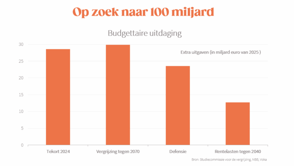 In 2024 hadden we met zo’n 55 procent van het bbp de derde hoogste overheidsuitgaven onder de industrielanden. Als we niet ingrijpen, zijn we de komende decennia op weg naar overheidsuitgaven van 65 procent van het bbp, veruit de hoogste van alle industrielanden. Rekening houdend met het huidige begrotingstekort en de extra facturen die er op ons afkomen, moeten onze overheden op zoek naar meer dan 100 miljard in euro’s van vandaag extra.