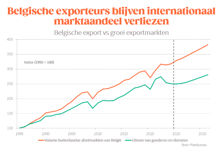 Nog belangrijker is dat de concurrentiepositie van onze exportbedrijven nog altijd vrij wankel staat. Volgens de nieuwste vooruitzichten van het Planbureau zouden de buitenlandse afzetmarkten van onze exporteurs in de periode 2025-2031 met 20% (in volume) groeien, terwijl de Belgische export in diezelfde periode maar met 12% zou toenemen. Dat impliceert een duidelijk verlies aan internationaal marktaandeel voor onze exporteurs. Dat past trouwens in een langere trend van afbrokkelend marktaandeel (met 36% sinds 1996).