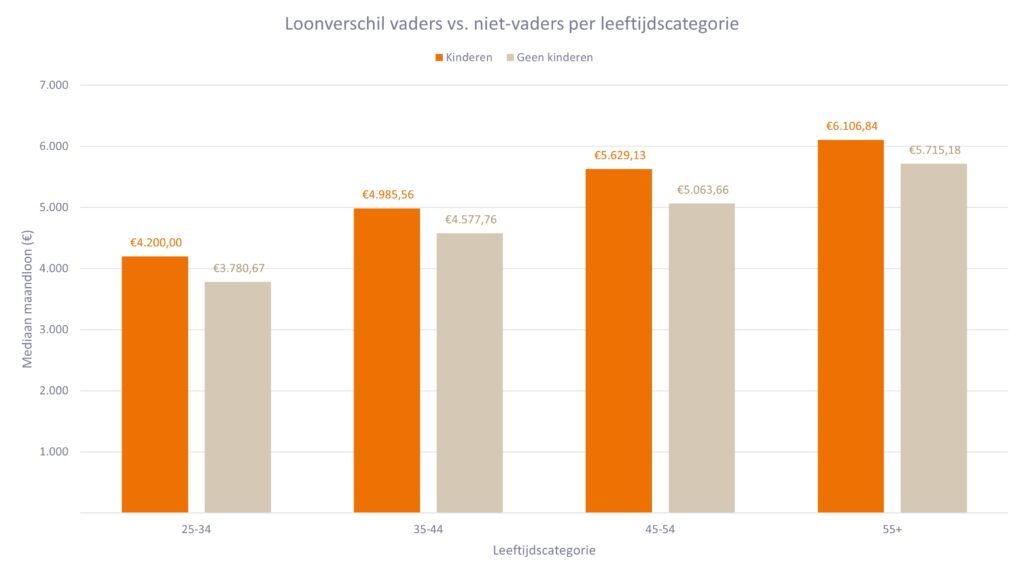 Het salarisverschil is duidelijk in alle leeftijdsgroepen. Vaders tussen 25 en 35 jaar verdienen gemiddeld 419 euro meer per maand dan hun leeftijdsgenoten zonder kinderen. Dit verschil wordt groter naarmate men ouder wordt en bedraagt 565 euro voor vaders van 45 tot 54 jaar. Hoewel het verschil kleiner wordt voor 55-plussers (392 euro), blijft het toch bestaan.